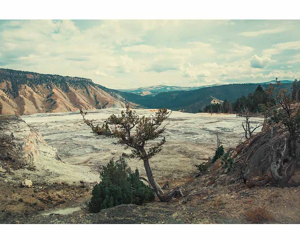 The Sculpted Landscape: This image showcases the surreal, white calcium carbonate deposits of Mammoth Hot Springs. The stark, barren terraces contrast dramatically with the distant, earthy mountains and the solitary, wind-sculpted tree, defining the North Yellowstone landscape.