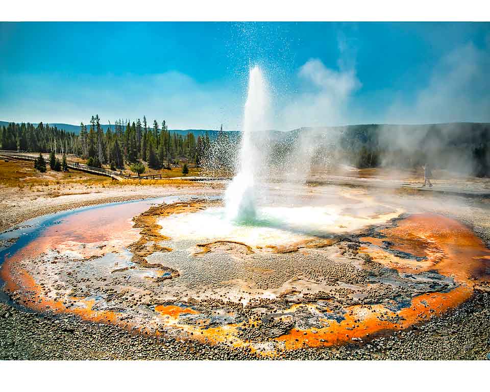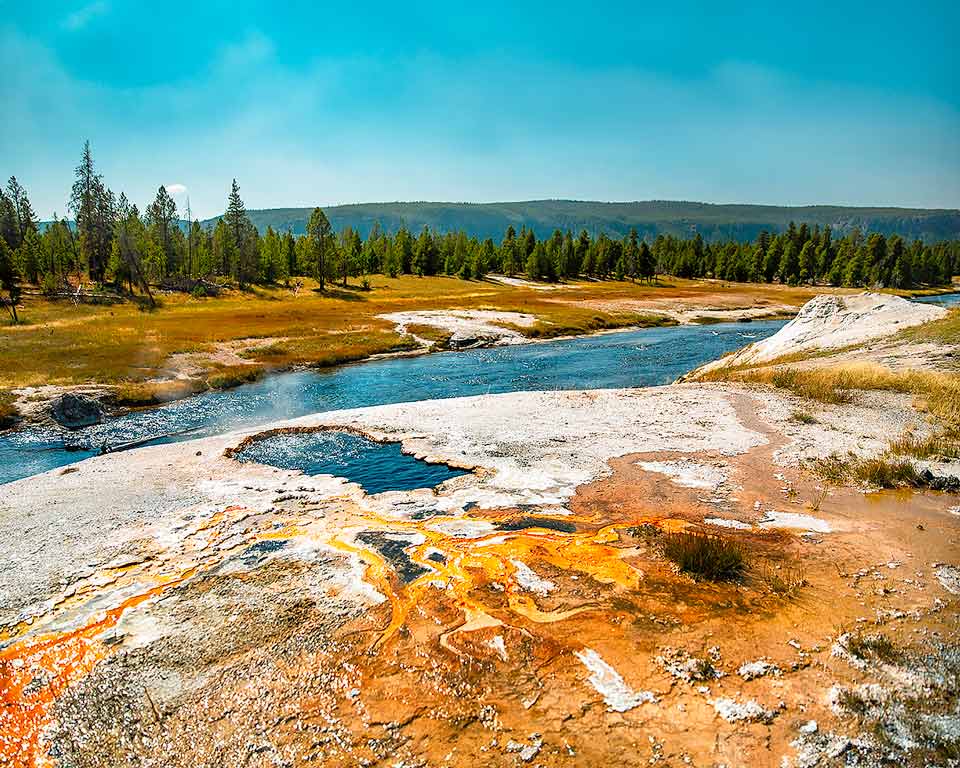 Step onto the iconic Yellowstone boardwalk for an unparalleled view of the park’s vibrant thermal world! This photo captures the scene near Chinese Spring in the Upper Geyser Basin. Imagine standing right here: The wooden walkway guides you directly along the banks of the Firehole River. The warm, clear water flows past a surreal landscape. The ground is painted with brilliant white and fiery orange mineral deposits from the thermal activity, offering an amazing color contrast. Moreover, this spot provides perfect, safe access for close-up views of the small, steaming hot springs surrounding you. Simply put, it’s the ultimate blend of dramatic geology and serene nature!